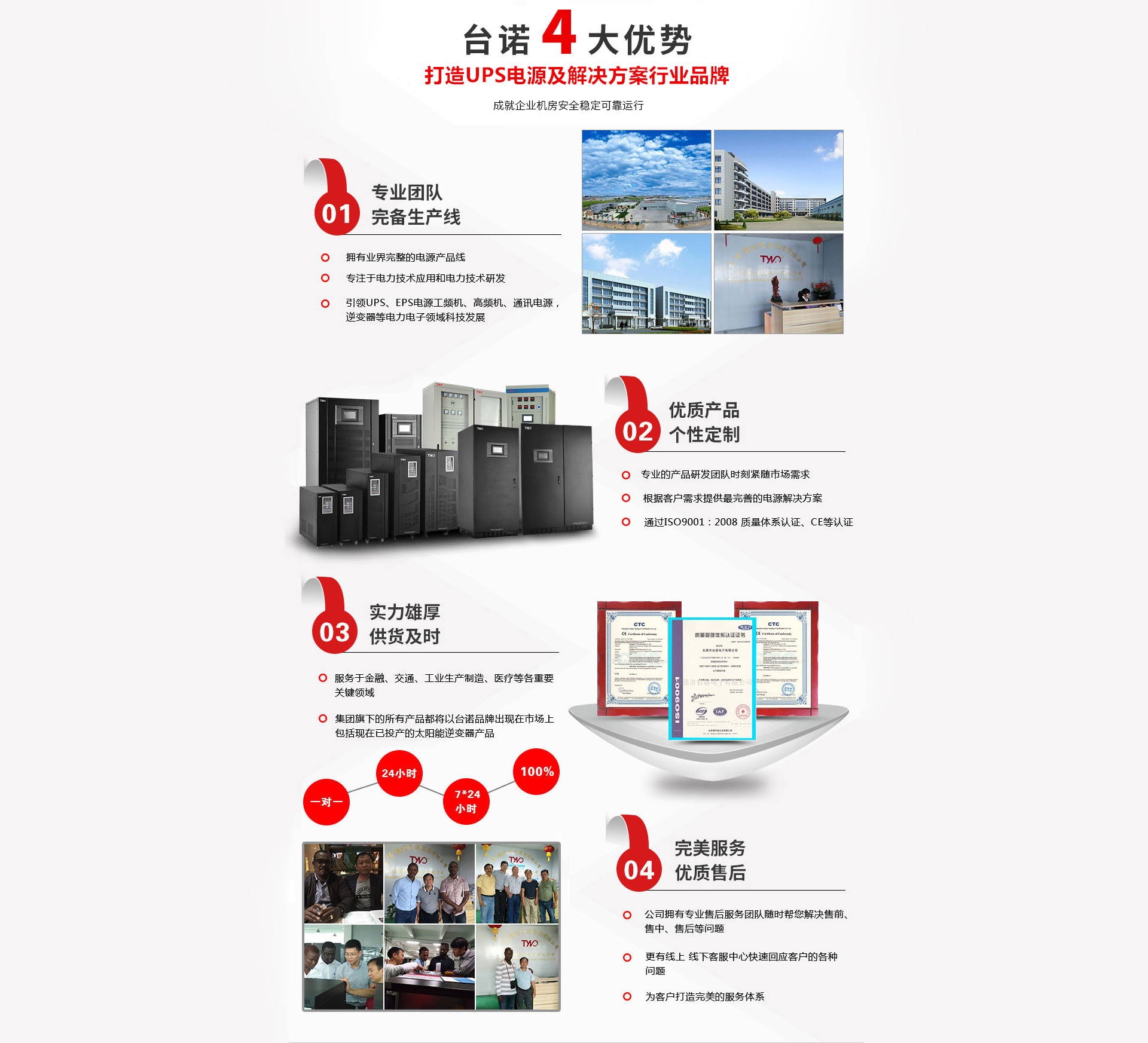 東莞市臺諾電子有限公司是一家以新能源、UPS不間斷電源、EPS應急電源、交直流穩(wěn)壓電源、鉛酸免維護蓄電池、智能變頻電源、智能開關電源、智能一體化逆變電源、智能電源監(jiān)控系統(tǒng)的研究、開發(fā)、生產、經營、銷售及技術推廣等多行業(yè)發(fā)展高新企業(yè)。公司位于東莞市毗鄰中國南方經濟重地廣州、深圳,交通發(fā)達,信息暢通。系廣東重點高新技術企業(yè)、東莞市創(chuàng)新型企業(yè)、也是中國電源協(xié)會、廣東省材料與器件產業(yè)技術創(chuàng)新戰(zhàn)略聯(lián)盟、 東莞市臺諾電子有限公司隸屬于臺諾集團,是一家有多年UPS集設計研發(fā)、生產銷售、售后服務為一體的公司,擁有業(yè)界完整的電源產品線,專注于電力技術應用和電力技術研發(fā)。公司致力于向全球客戶提供性能好、品質好的產品與服務。UPS、EPS電源工頻機、高頻機、通訊電源、光伏、逆變器等電力電子領域科技發(fā)展,創(chuàng)造可靠、節(jié)能的產品,致力于為客戶提供完善的電源解決方案。產品廣泛應用于政府、金融、通信、教育、交通、氣象、廣播電視、工商...